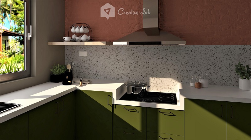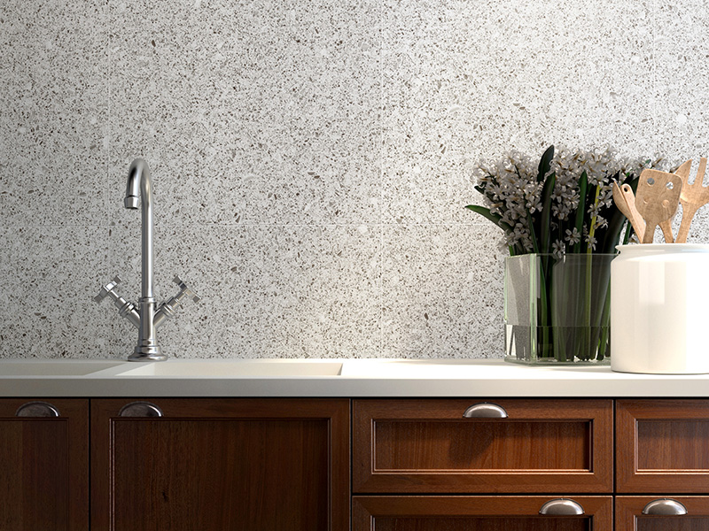 Một trong những cách đơn giản nhưng sáng tạo nhất để ốp gạch terrazzo tại nhà là làm tấm ốp tường bếp. Backsplash hay tấm ốp tường là phần phía sau bếp hoặc bồn rửa, tấm ốp tường bếp bằng gạch terrazzo giúp bảo vệ tường khỏi dầu mỡ và vết bẩn khi làm bếp, giúp dễ lau chùi, và đây cũng là nơi tạo điểm nhấn cho gian bếp. Sự lựa chọn này sẽ nâng cao tính thẩm mỹ cho nhà bếp của bạn đồng thời phục vụ mục đích thiết thực, vì các mẫu terrazzo với màu sắc nổi bật và họa văn độc đáo, đa dạng có thể biến nhà bếp của bạn thành một điểm nhấn tuyệt đẹp.