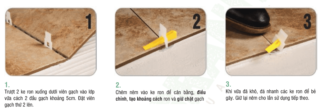 Bộ cân bằng gạch bao gồm ke nhựa, nêm và kìm (nếu cần thiết). Sử dụng bộ cân bằng này để đảm bảo khoảng cách nhất quán giữa các viên gạch cũng như giảm ảnh hưởng của lippage nếu có.